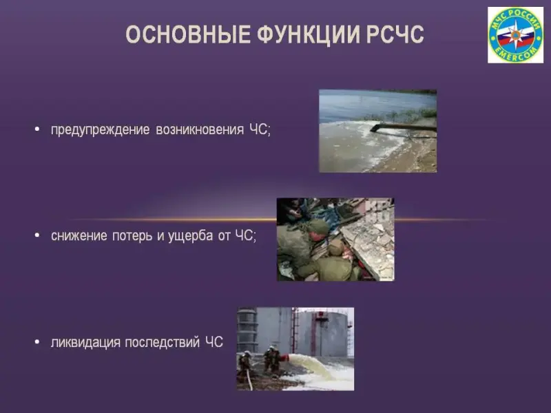 Возложенные на РСЧС официальные задачи и анализ ее реальной роли в ЧС различного происхождения позволяют сделать вывод о том, что эта роль сводится к трем целевым функциям системы (слайд 8):