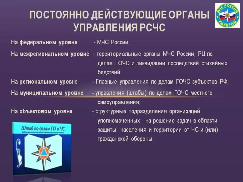 - на федеральном уровне - МЧС РФ, подразделения федеральных органов исполнительной власти, предназначенные для решения задач в области защиты населения и территорий от ЧС и (или) гражданской обороны;
