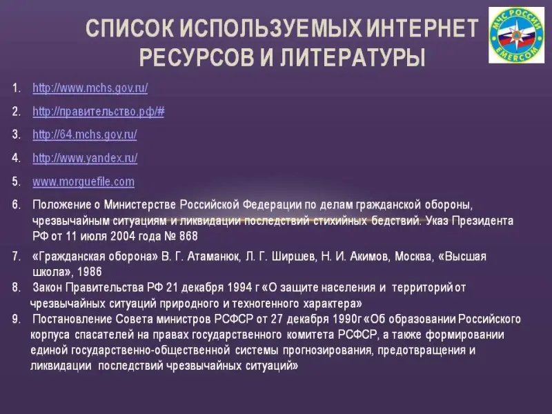 «МЧС России» - это министерство Российской Федерации по делам гражданской обороны, чрезвычайным ситуациям и ликвидации последствий стихийных бедствий (МЧС России) является федеральным органом исполнительной власти, осуществляющим функции по выработке и реализации государственной политики, нормативно-правовому регулированию, а также по надзору и контролю в области гражданской обороны, защиты населения и территорий от чрезвычайных ситуаций природного и техногенного характера, обеспечения пожарной безопасности и безопасности людей на водных объектах.