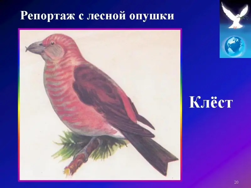 Ученик: Где ельник, там и клесты (слайд 20). Так уж они, клесты, приспособились - еловыми семенами питаются. Потому и говорят: клёст-еловик. Летит стайка клестов, перекликается звонкими голосами: «Кик… кик…кик!..» Как увидят ель, у которой вершина шишками увешана, сразу по ветвям рассыплются - и пошла работа! Схватит клёст шишку, оторвёт её клювом, прижмёт лапой к ветке и отворачивает чешуйку за чешуйкой, мелкие крылатые семена достаёт. Клюв у клеста крючком, как раз для такого дела подходит. Клёст - воздушный гимнаст. Благодаря сильному и крепкому клюву он даже крутится на ветке. По клюву и узнаешь его сразу. Да и окраска поможет: она у клеста яркая, красная. А птенцов клесты в любое время года выводят, даже зимой. Было бы шишек много, было бы чем детей выкормить, а мороз им не страшен.