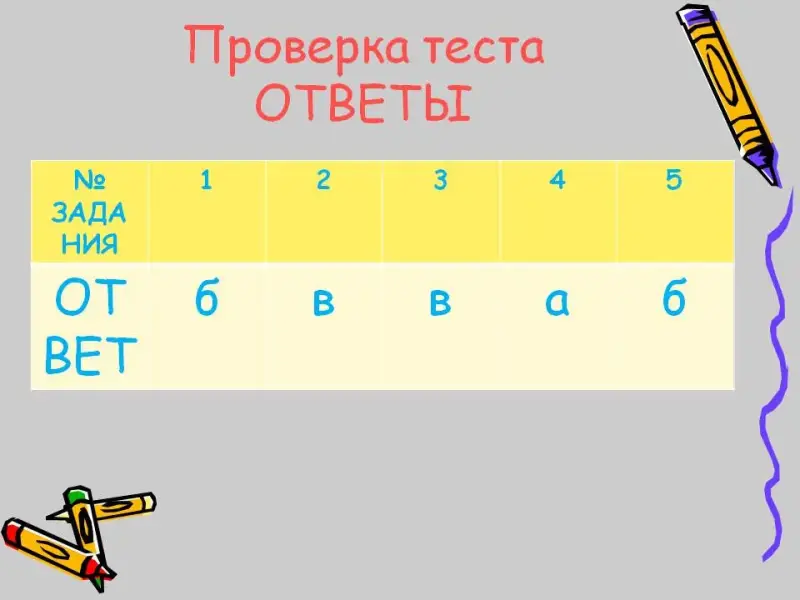 Учащимся предлагается тест на 5 минут, затем они обмениваются тетрадями и проверяют тесты по готовым ответам. Учащиеся выставляют друг другу оценки.