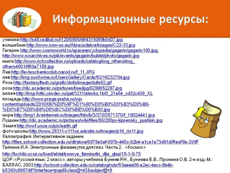 - Журжина Ш.В., Костромина Н.В.Дидактический материал по русскому языку: 2 кл. Пособие для учащихся четырёхлетней начальной школы. - М.: Просвещение, 1987.