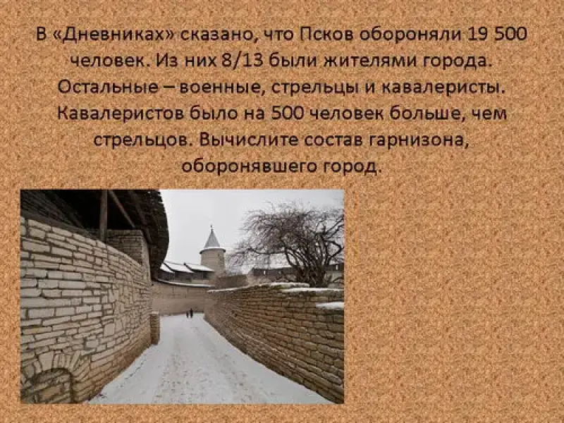 - В "Дневниках" сказано, что Псков обороняли 19 500 человек. Из них 8/13 были жителями города. Остальные - военные, стрельцы и кавалеристы. Кавалеристов было на 500 человек больше, чем стрельцов. Вычислите состав гарнизона, оборонявшего город. (ЖИТЕЛЕЙ - 12 ТЫС. ЧЕЛ., СТРЕЛЬЦОВ - 3,5 ТЫС. ЧЕЛ., КАВАЛЕРИСТОВ - 4 ТЫС. ЧЕЛ.)
