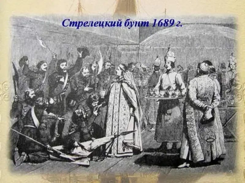 Учитель истории, (слайд 7): Стрелецкий бунт 1682 года) 27 апреля (7 мая) 1682 года после 6 лет правления скончался болезненный царь Фёдор Алексеевич. Заручившись поддержкой патриарха Иоакима, Нарышкины и их сторонники 27 апреля (7 мая) 1682 года возвели на престол Петра. Фактически к власти пришёл клан Нарышкиных и вызванный из ссылки Артамон Матвеев, объявленный "великим опекуном". Милославские, родственники царевича Ивана и царевны Софьи по их матери, усмотрели в провозглашении Петра царём ущемление своих интересов. Стрельцы, которых в Москве было более 20 тысяч, уже давно проявляли недовольство и своенравие; и, видимо, подстрекаемые Милославскими, 15 (25) мая 1682 года выступили открыто: с криками, что Нарышкины задушили царевича Ивана, двинулись к Кремлю. Наталья Кирилловна, надеясь успокоить бунтовщиков, вместе с патриархом и боярами вывела Петра с братом на Красное крыльцо. Однако восстание не закончилось. В первые часы были убиты бояре Артамон Матвеев и Михаил Долгорукий, потом и другие сторонники царицы Натальи, в том числе два её брата Нарышкины. 26 мая выборные от стрелецких полков явились во дворец и потребовали, чтобы старший Иван признавался первым царём, а младший Пётр - вторым.