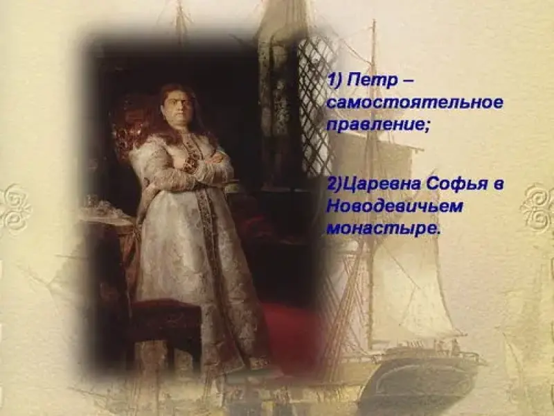 (слайд 10) 7 сентября 1689 года правительство Софьи Алексеевны пало, ее имя было исключено из царского титула, а саму ее отправили в Новодевичий монастырь в Москве, без пострижения в монахини.