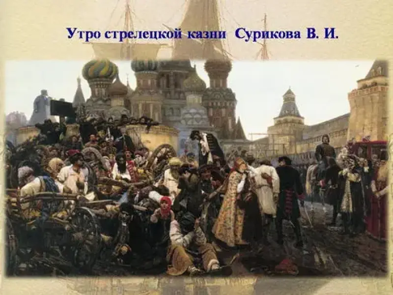Обратимся к картине Сурикова "Утро стрелецкой казни" Что сближает картину Сурикова и страницы романа, изображающие стрелецкие казни и поведение Петра?