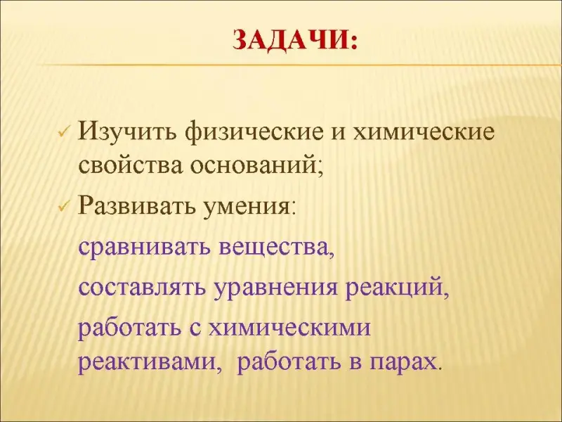 - познакомить учащихся с физическими свойствами оснований;