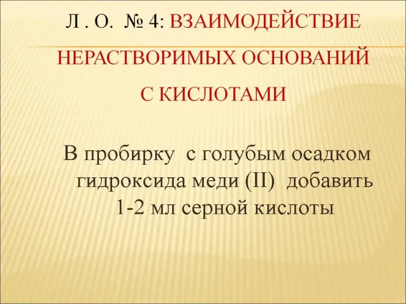| IV | Первичная проверка усвоения материала и закрепление знаний | Учитель предлагает учащимся сделать выводы о химической активности щелочей и нерастворимых основаниях.