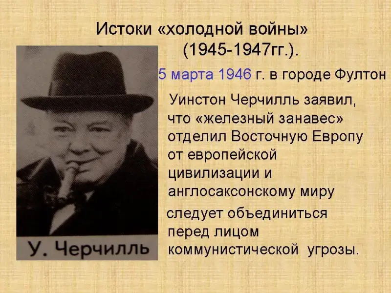 I. Истоки холодной войны (1945-1947гг.) Давайте начнем с истоков «холодной войны». 1. Обратимся к документу, к известной нам речи У. Черчилля «Мускулы мира» 5 марта 1946г., Фултон