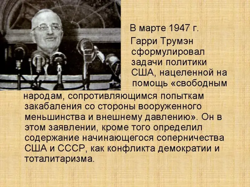 2. 12 марта 1947 г. еще один лидер выступил с не менее известной речь, которая стала доктриной внешней политики государства. И эту речь тоже считают истоком «холодной войны»
