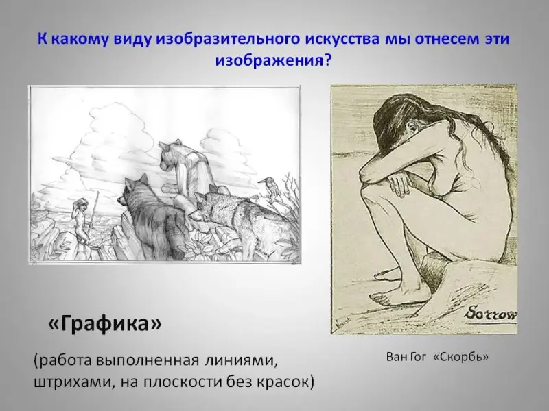 (Слайд 2. «Графика») Ответы детей: Работа выполненная линиями, штрихами, на плоскости без красок.