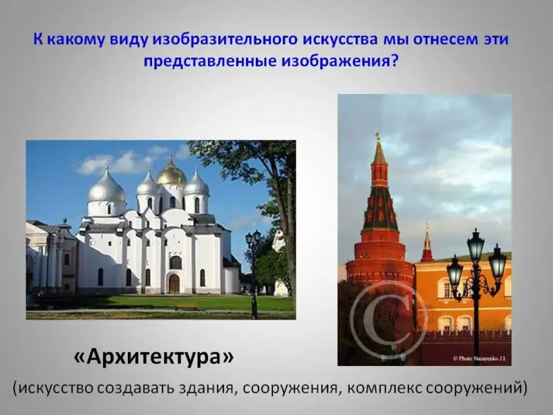 (Слайд 3. «Архитектура») Ответы детей: Искусство создавать здания, сооружения, комплекс сооружений.
