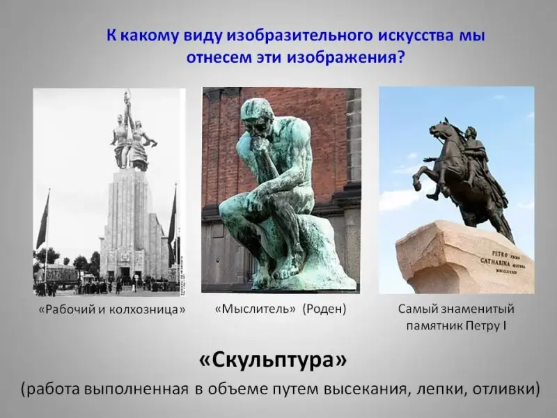 (Слайд 4. «Скульптура») Ответы детей: Работа выполненная в объеме путем высекания, лепки, отливки.