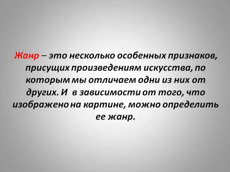 Жанр - это несколько особенных признаков, присущих произведениям искусства, по которым мы отличаем одни из них от других. И в зависимости от того, что изображено на картине, можно определить ее жанр. Другим словом, отличаем мы жанры картин по их содержанию.