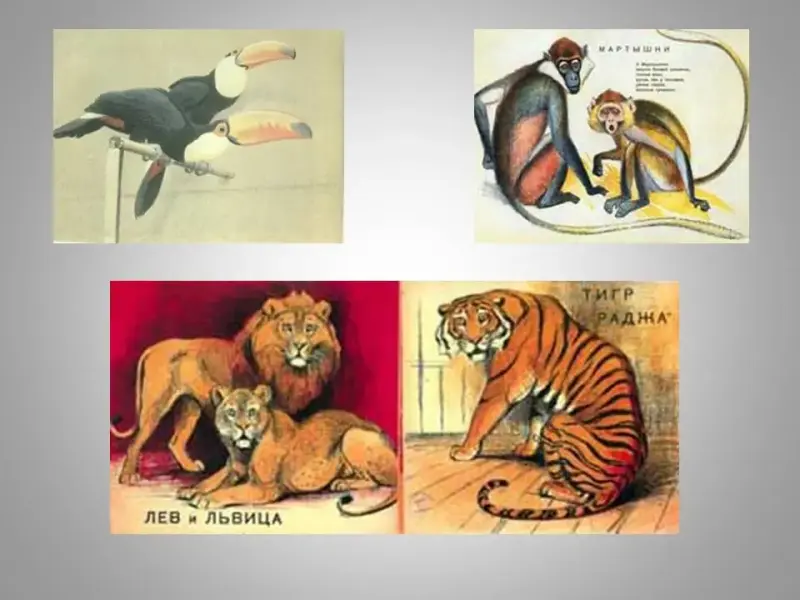 - Обратите внимание на то, как художник, верно, передает всю пластику и выразительность образа животного с его характером (рассматривание картин). Характер зверя выражается через движение и форму тела, стремительного и гибкого или громоздкого и неуклюжего (пантера, крокодил, медведь), изящного или могучего; через пропорции: большая голова, длинные ноги и короткие лапы, выгнутая спина, большие и маленькие глаза; через выразительные детали: лохматую и гладкую шерсть, через форму ушей, когти, усы, блеск глаз. Художник не просто копирует, но эмоционально усиливает то, что выражает характер, делает видимым то, что понял, почувствовал. Именно поэтому художник внимателен к своим ощущениям.