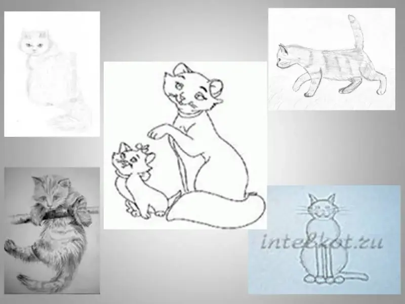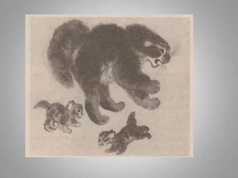 Я люблю кошку. (Слайд 23) Посмотрите, как я буду рисовать ее. Кошка может быть ласковой и доброй. Но если ее котятам грозит опасность, она всем своим видом как бы говорит: «Не подходи, берегись!» (Слайд 24, 25)