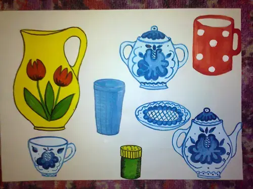 В: Федора разбила не только чашку, но и много другой посуды. Такая она неаккуратная. Видела я ее посуду, то одной части не хватает, то другой. Давайте попробуем починить посуду, для этого надо дорисовать и назвать недостающие части. (Раздает листочки, дети садятся за столы и дорисовывают недостающие детали, комментируя свои действия).
