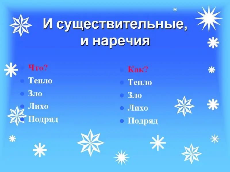 Учитель: Спорят 2 ученика одного класса. Один утверждает, что тепло, лихо, зло, подряд - это наречия. Другой утверждает, что это существительные. Кто прав? Подумайте и ответьте. (Слайд 1)