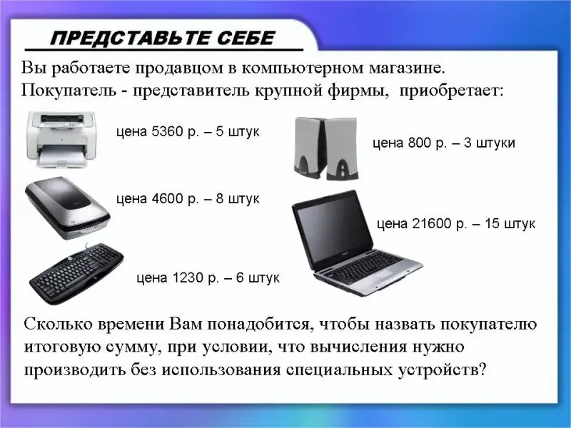 Вопрос к учащимся: «Сколько времени Вам понадобится, чтобы назвать покупателю итоговую сумму, при условии, что вычисления нужно производить без использования специальных устройств?»