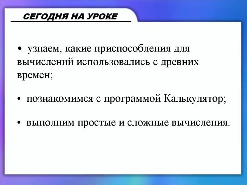 - формирование умения выполнять вычисления с помощью Калькулятора