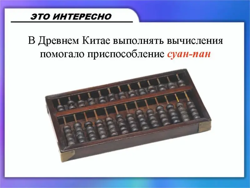 (Слайд 5) В Древнем Китае - приспособление суан-пан,которое очень похоже на обыкновенные счеты.