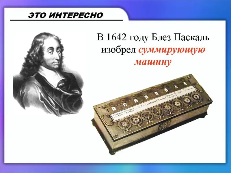 (Слайд 7) Выдающимся изобретением французского ученого Блеза Паскаля стала механическая суммирующая машина, выполняющая сложение и вычитание.