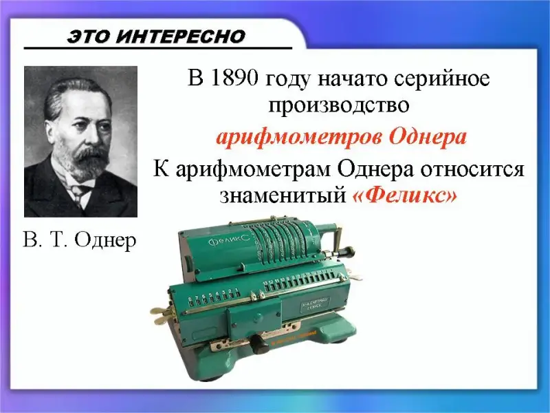 (Слайд 8) В 1890 году начато серийное производство арифмометров Однера. К арифмометрам Однера относится знаменитый «Феликс».