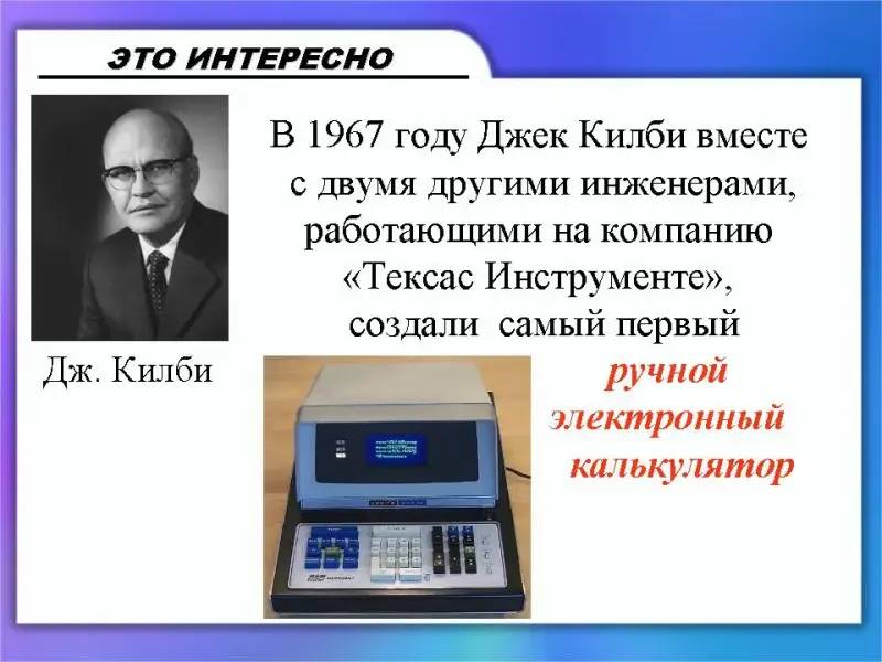 (Слайд 9) В 1967 году Джек Килби вместе с двумя другими инженерами, работающими на компанию «Тексас Инструменте», создали самый первый ручной электронный калькулятор.
