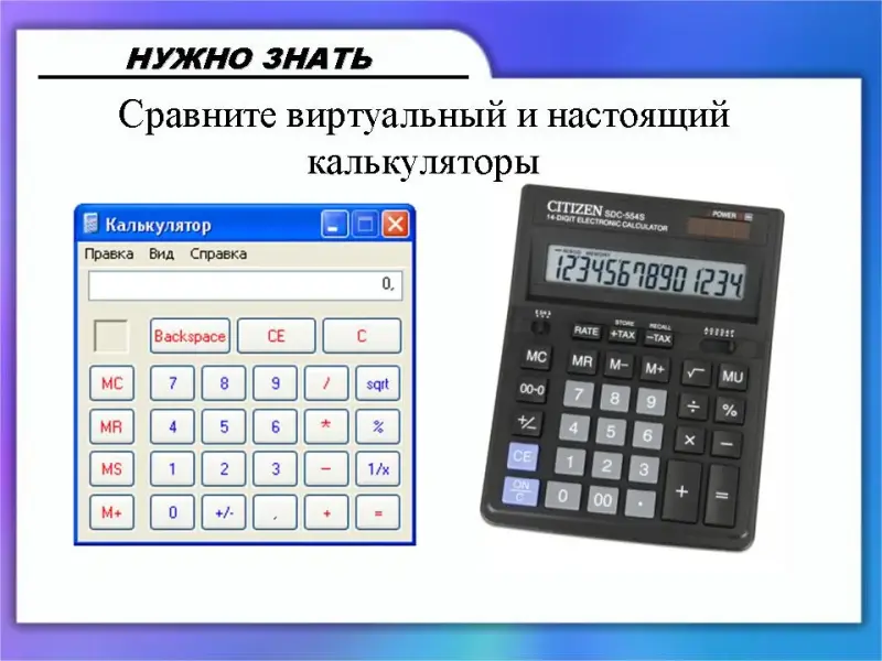 (Слайд 11) Посмотрите, как похожи окно этой программы и настоящий калькулятор. Если вам знаком настоящий калькулятор, то освоение виртуального не составит труда.