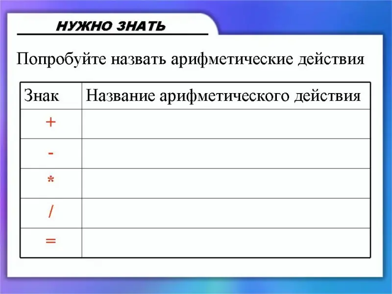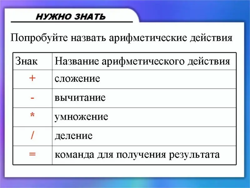 (Слайд 15) Обратите внимание, что некоторые знаки арифметических действий отличаются от тех, которые мы используем в математике. Попробуйте назвать их.