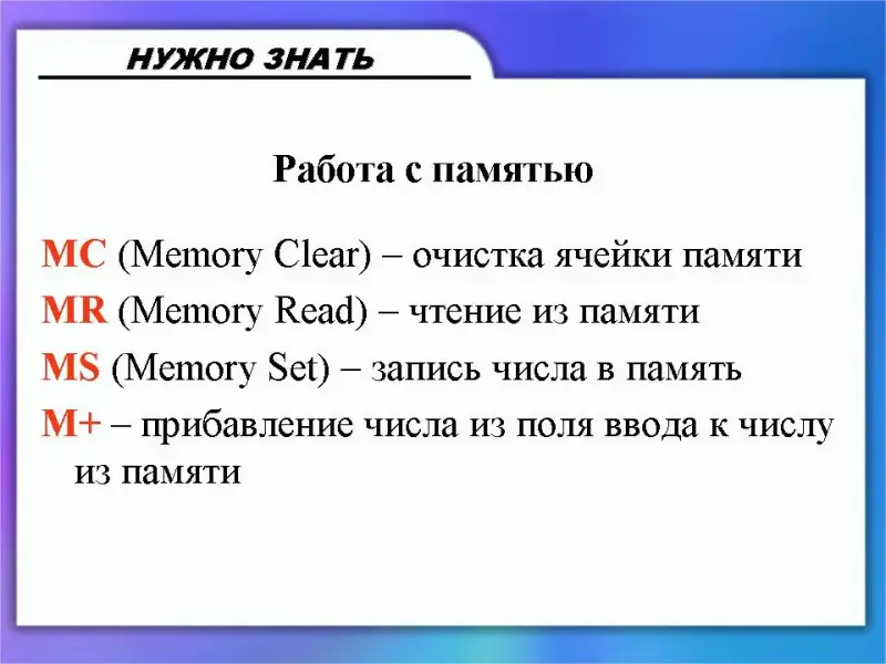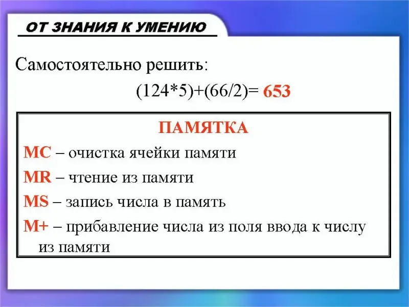 (Слайд 18) Часто при решении сложных задач требуется запомнить промежуточный результат. Для этого в программе Калькулятор предусмотрены кнопки: