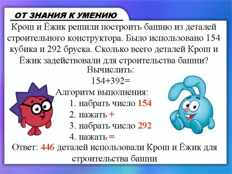 (Слайд 19) Крош и Ёжик решили построить башню из деталей строительного конструктора. Было использовано 154 кубика и 292 бруска. Сколько всего деталей Крош и Ёжик задействовали для строительства башни?