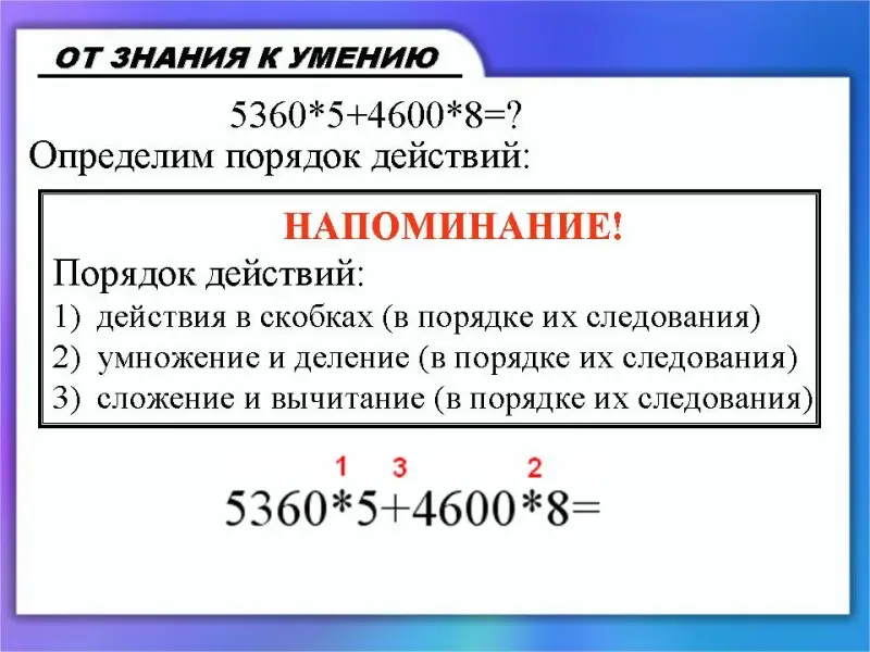 (Слайд 28) Для начала определим порядок действий. На уроках математики вам говорили, что действия выполняются в следующем порядке: действия в скобках, умножение и деление, сложение и вычитание.