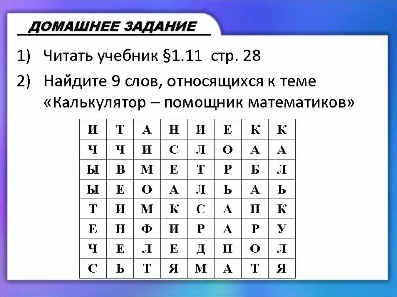 - Найдите 9 слов, относящихся к теме «Калькулятор - помощник математиков» (Приложение 1)