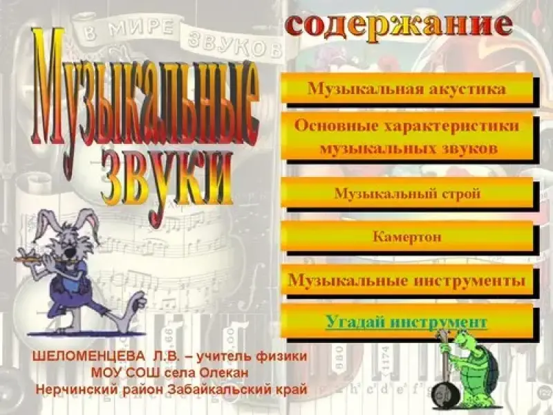 Оборудование: ПК, мультимедиа проектор, электронная презентация (ЭП) "Музыкальные звуки" (Приложение Презентация 1), камертон, музыкальные инструменты, электронное пособие "Музыкальные инструменты".