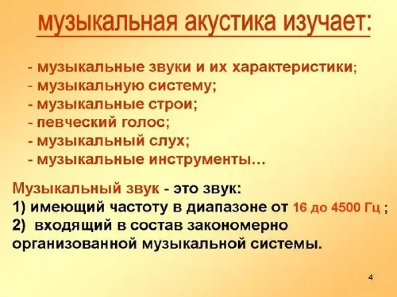 Музыкальная акустика изучает: музыкальные звуки, соотношения высот и громкость музыкальных звуков, музыкальные строи, человеческий голос, музыкальный слух, музыкальные инструменты. (С 4)