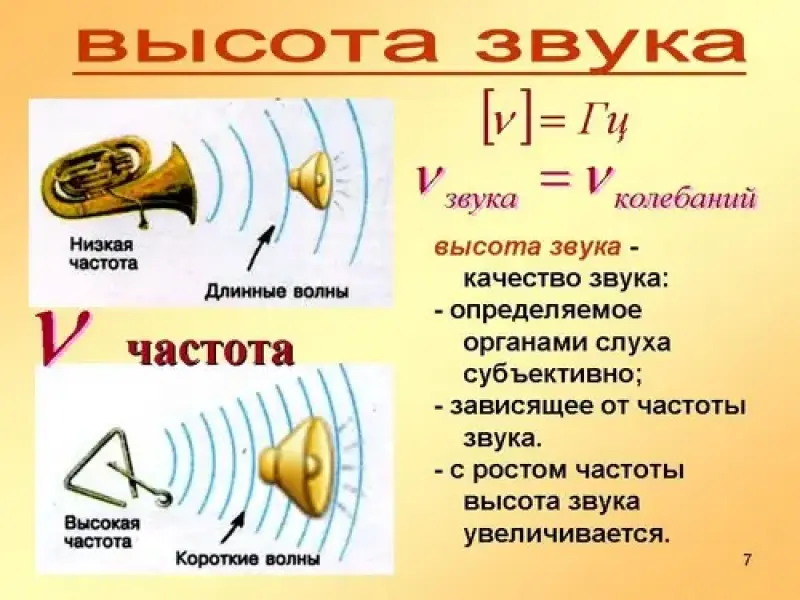 - высота звука - качество звука, определяемое органами слуха субъективно и зависящее от частоты звука; с ростом частоты высота звука увеличивается.