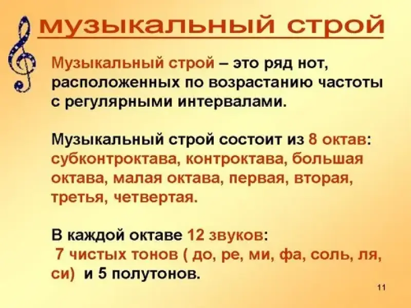 6. Музыкальный строй - это ряд нот, расположенных по возрастанию частоты с регулярными интервалами. (С 11)