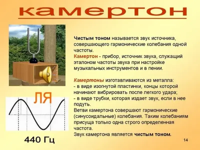 Камертон - прибор, источник звука, служащий эталоном частоты звука при настройке музыкальных инструментов и в пении. (С 14)