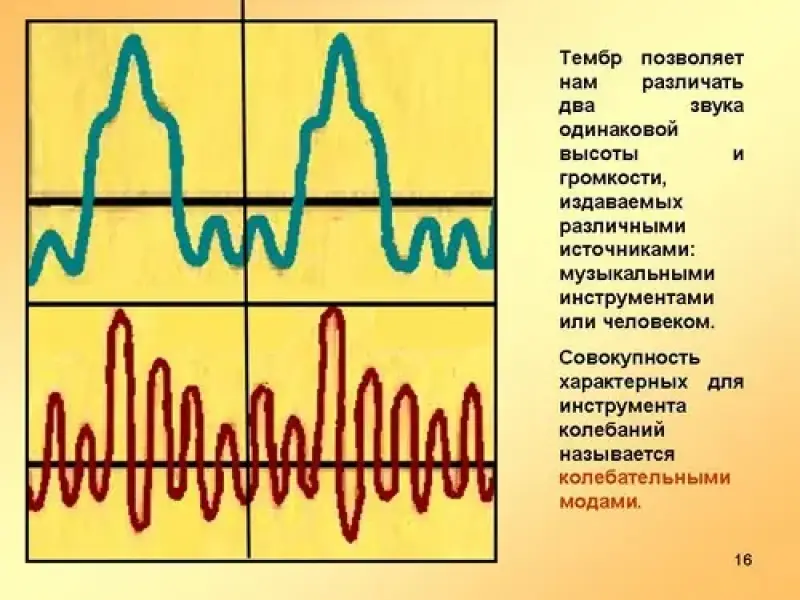 Тембр позволяет нам различать два звука одинаковой высоты и громкости, издаваемых различными источниками: музыкальными инструментами, человеком.