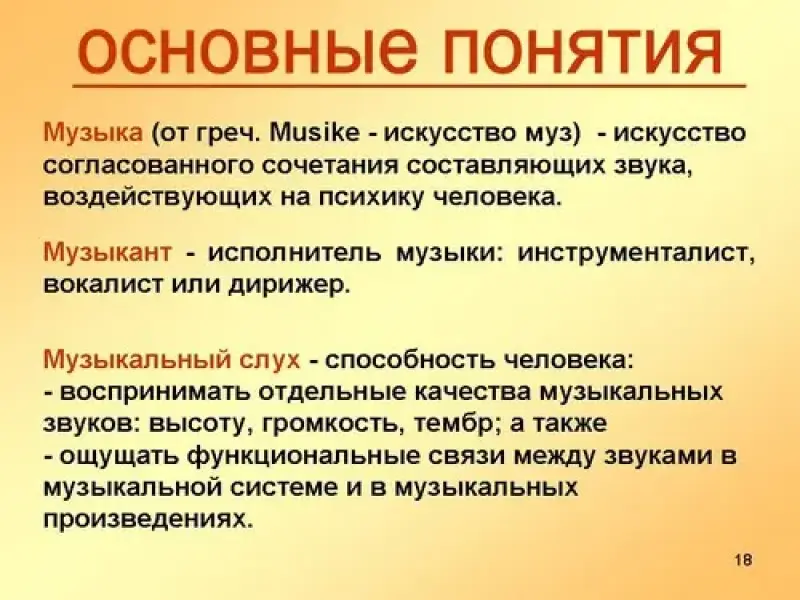 11. Музыкальный слух - способность человека воспринимать отдельные качества музыкальных звуков: высоту, громкость, тембр, а также ощущать функциональные связи между звуками в музыкальной системе и в музыкальных произведениях.