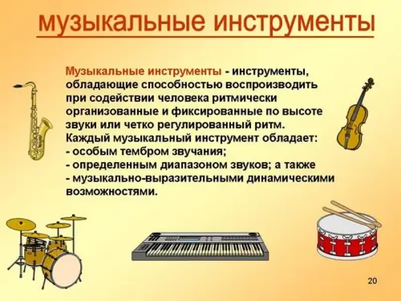 12. Музыкальные инструменты - инструменты, обладающие способностью воспроизводить при содействии человека ритмически организованные и фиксированные по высоте звуки или четко регулированный ритм. (С 20)