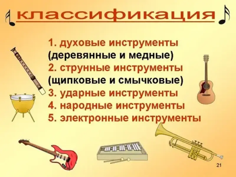 Существует множество классификаций музыкальных инструментов. (С 21) Самая распространенная делит все музыкальные инструменты в зависимости от источника звука: