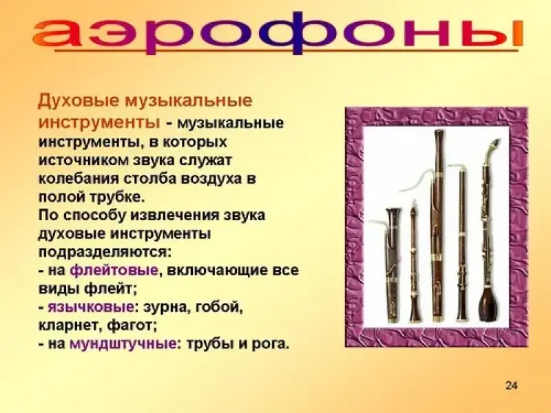 Духовые музыкальные инструменты - музыкальные инструменты, в которых источником звука служат колебания столба воздуха в полой трубке.