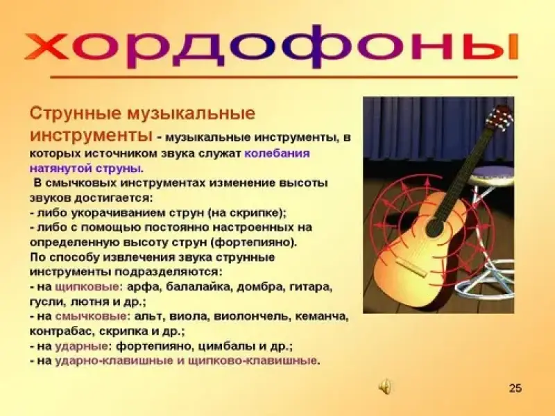 Струнные музыкальные инструменты - музыкальные инструменты, в которых источником звука служат колебания натянутой струны.