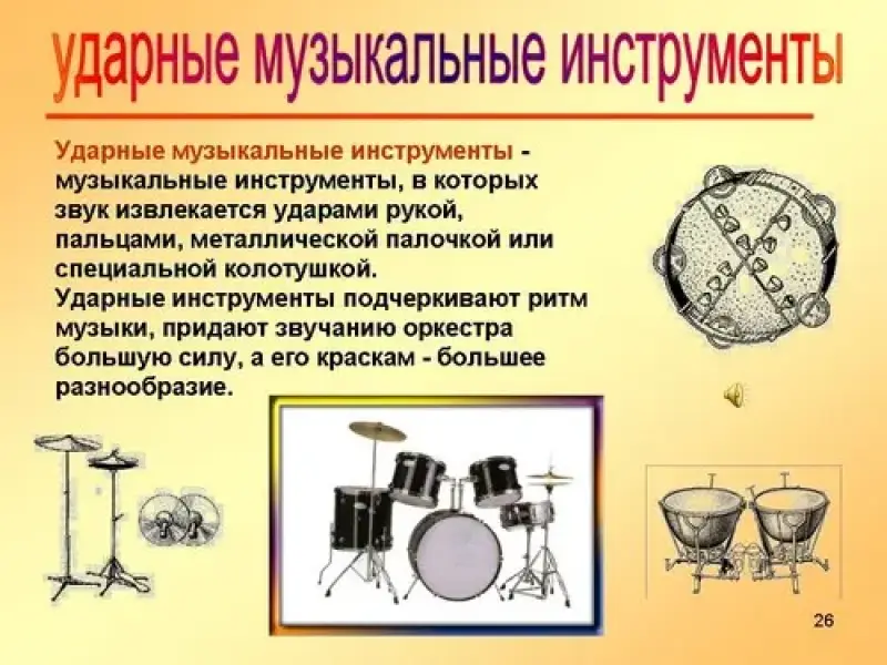 Ударные инструменты подчеркивают ритм музыки, придают звучанию оркестра большую силу, а его краскам - большее разнообразие.