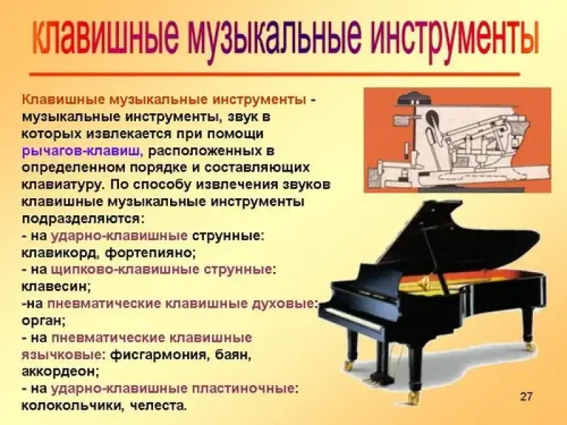 Клавишные музыкальные инструменты - музыкальные инструменты, звук в которых извлекается при помощи рычагов-клавиш, расположенных в определенном порядке и составляющих клавиатуру. По способу извлечения звуков клавишные музыкальные инструменты подразделяются: (27)