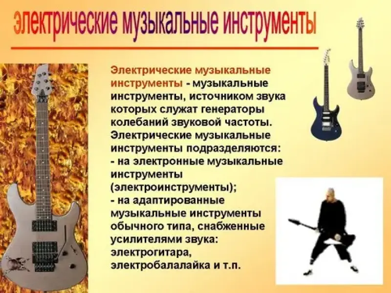 Электрические музыкальные инструменты - музыкальные инструменты, источником звука которых служат генераторы колебаний звуковой частоты. Электрические музыкальные инструменты подразделяются: (С 30)