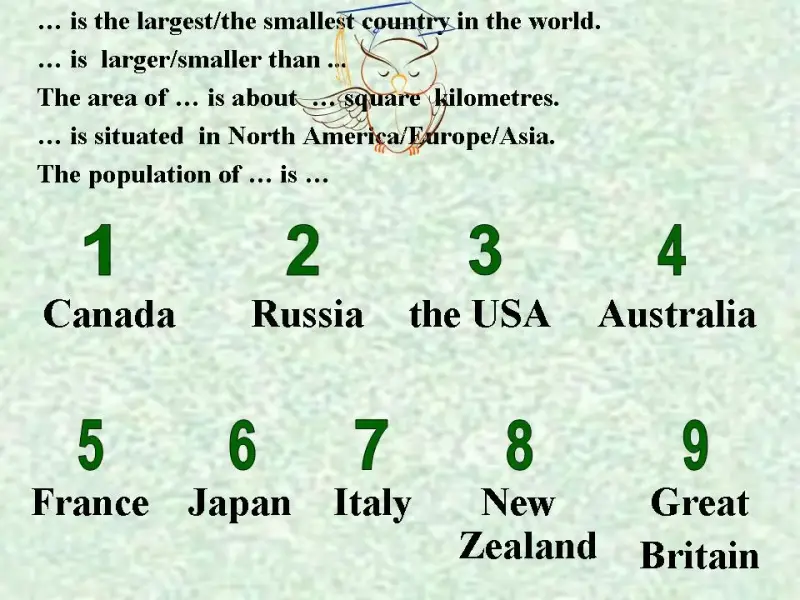 II. На экране появляются (на доску вывешиваются) карточки с цифрами от одного до девяти, под ними названия стран, расположенные по их величине, начиная с самой большой и заканчивая самой маленькой (слайд 5). «To my mind these countries stand from the largest to the smallest. Canadaisthe largest country of all, Russia is smaller than Canada, the USA is smaller than Russia, Australia is smaller than the USA, France is smaller than Australia, Japan is smaller than France, Italy is smaller than Japan, New Zealand is smaller than Italy, Great Britain is smaller than New Zealand. Great Britain is the smallest country of all. Am I right? Ifnotraiseyourcardsandrearrangethecountries».