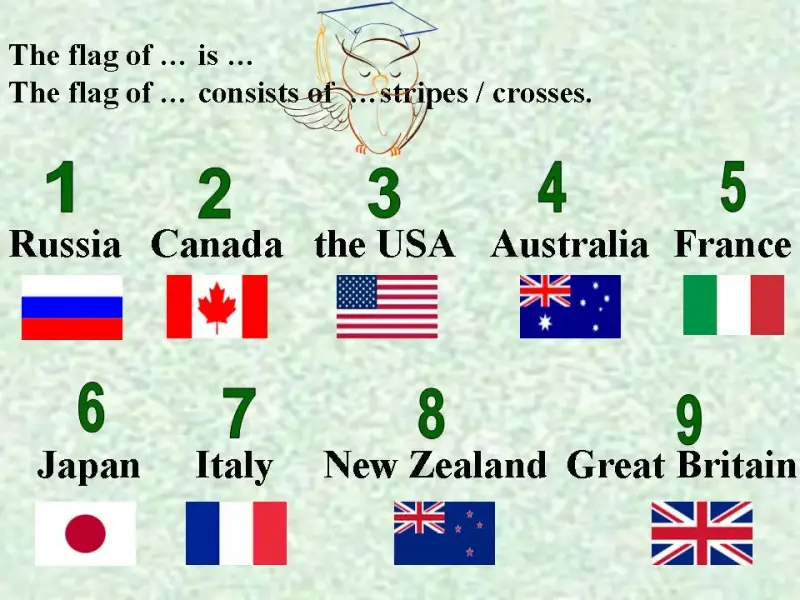IV. Далее под названиями стран появляются (вывешиваются) флаги этих стран (слайд 6) «Andherearetheflagsofthesecountries. This is the flag of … And this is the